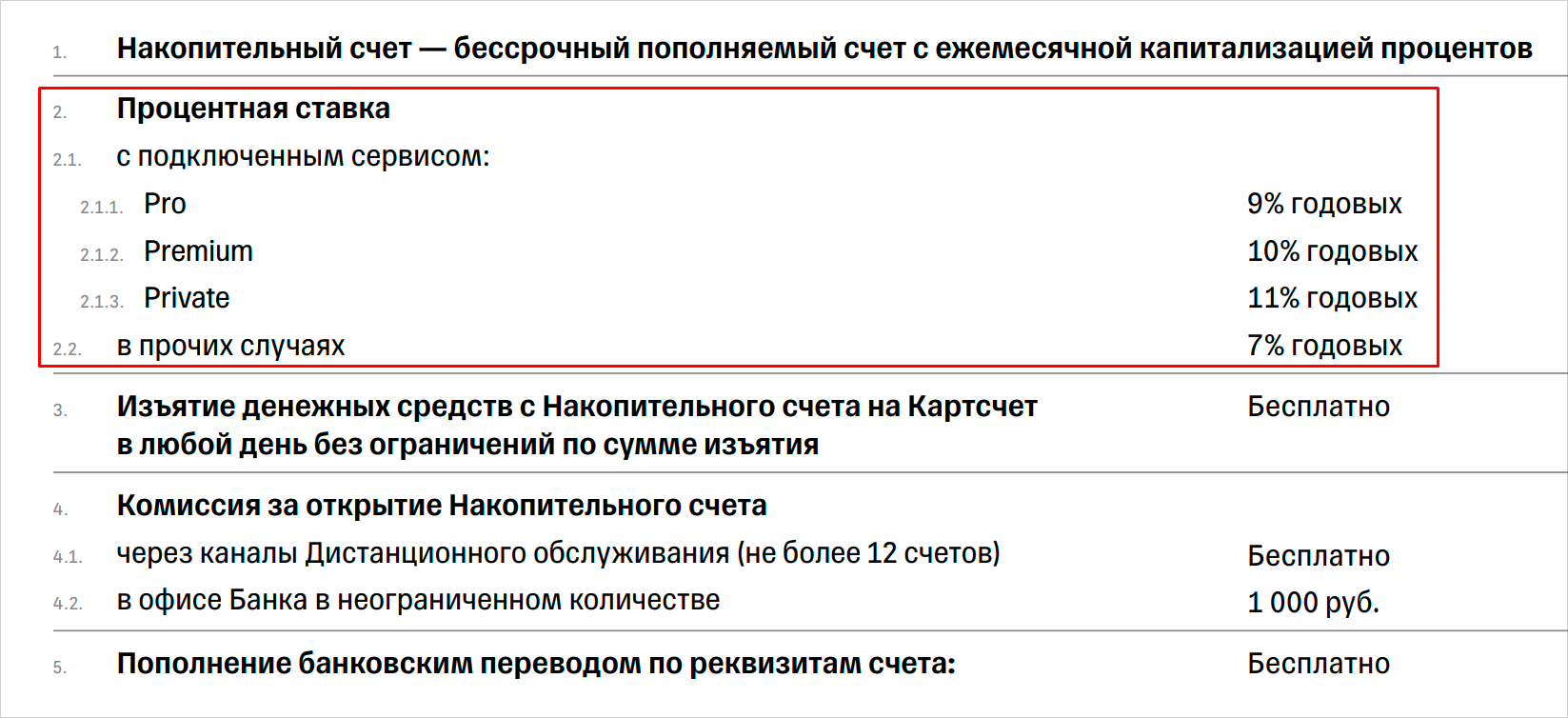 В апреле 2026 года базовая процентная ставка — 7% годовых. Владельцам подписки «Про» банк начисляет 9% годовых. Пользователи сервиса «Премиум» получают 10% годовых. Максимальная ставка в 11% годовых доступна клиентам с премиальным уровнем Private.