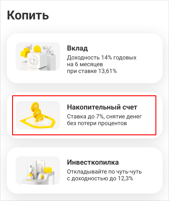 У вас уже есть карта банка. Тогда все проще: заходите в мобильное приложение, далее выбираете «Копить», затем «Накопительный счет» и жмете «Открыть счет». Готово — оформление занимает не больше минуты.