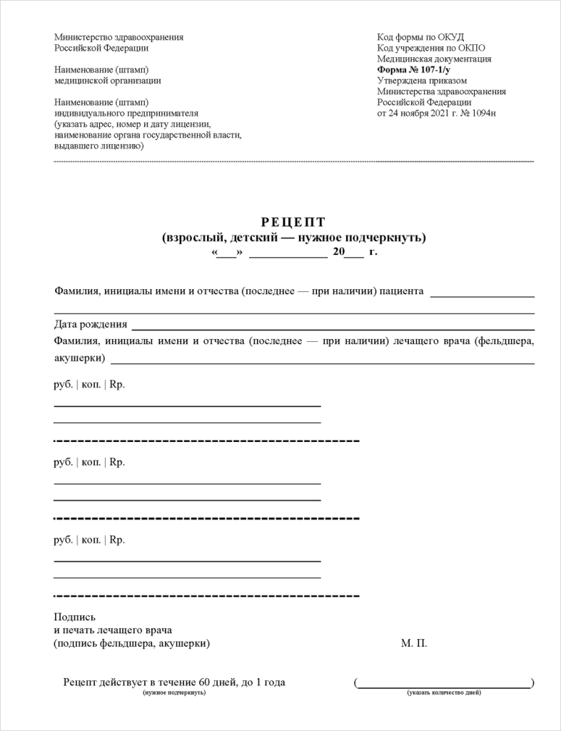 Врач выписывает рецепт на специальном бланке, который утвержден приказом Минздрава № 1094н.