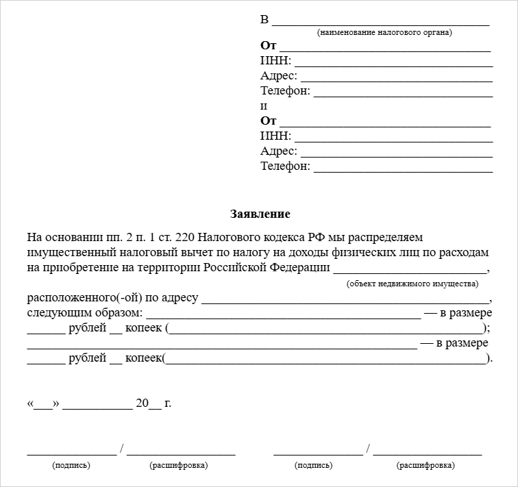 Если жилье стоило меньше 4 млн рублей, супруги на свое усмотрение распределяют, кто и с какой части расходов получит вычет. Например, жена — с 1 млн рублей, а муж — с 2 млн рублей.Оформляют возврат стандартно — через налоговую или работодателя, но к пакету документов также прилагают свидетельство о браке и заявление в свободной форме о распределении вычета между мужем и женой.
