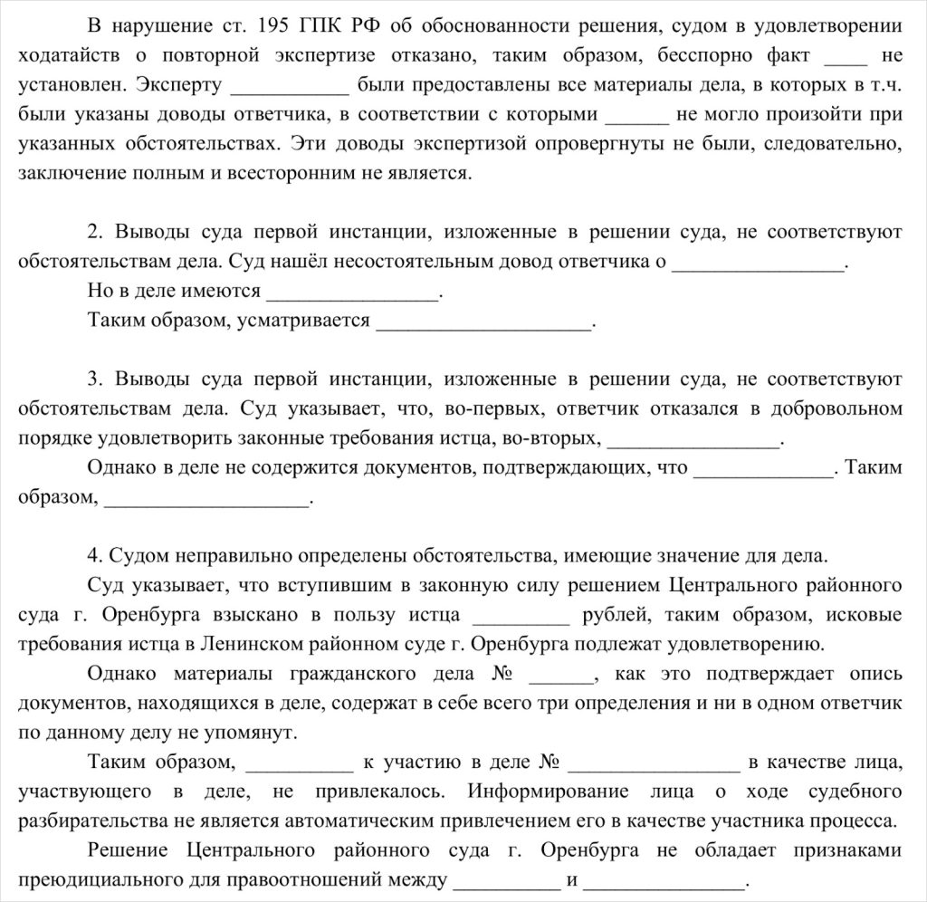 Основания, по которым возможно апелляционное обжалование, мы разбирали выше — все они перечислены в статье 330 ГПК РФ. Например, в жалобе можно написать, что суд неправильно определил обстоятельства дела или неверно применил закон.