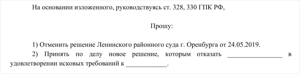 Мотивировочная часть. Здесь вы объясняете, почему не согласны с решением суда первой инстанции. Раскрываете, почему оно подлежит отмене полностью или частично, а также уточняете, на каком основании требуете пересмотра.