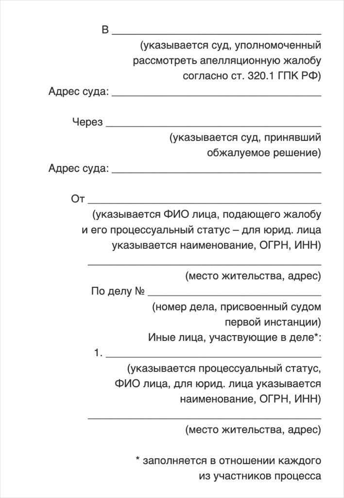 В законе нет обязательной формы апелляционной жалобы. Но есть статья 322 ГПК РФ, которая определяет содержание документа.