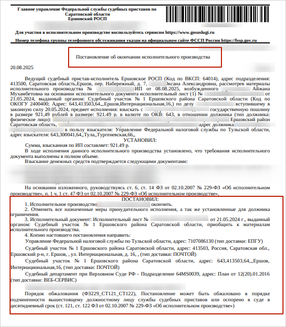 - Основание для окончания — точную ссылку на статью и пункт закона № 229-ФЗ, по которому закрыто дело.