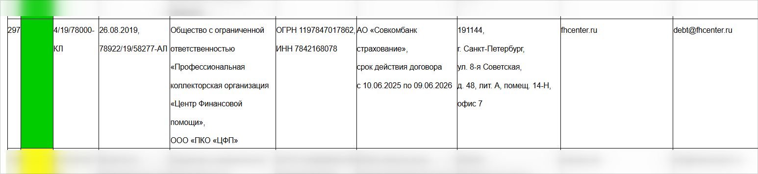 Также обратите внимание на цветовой индикатор в первой колонке таблицы. Зеленый цвет, как у «ЦФП», означает, что коллекторское агентство соблюдает закон и не допускает нарушений при взаимодействии с должниками.