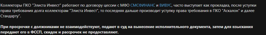 В отзывах пишут, что «Элиста Инвест» выкупает долги у МФО «Вивус», «СмсФинанс» и «Вэббанкир». Также могут перекупить долг у другой коллекторской организации. Например, на форумах упоминается небезызвестное агентство «М.Б.А. Финансы». Но официального подтверждения таким отзывам нет.