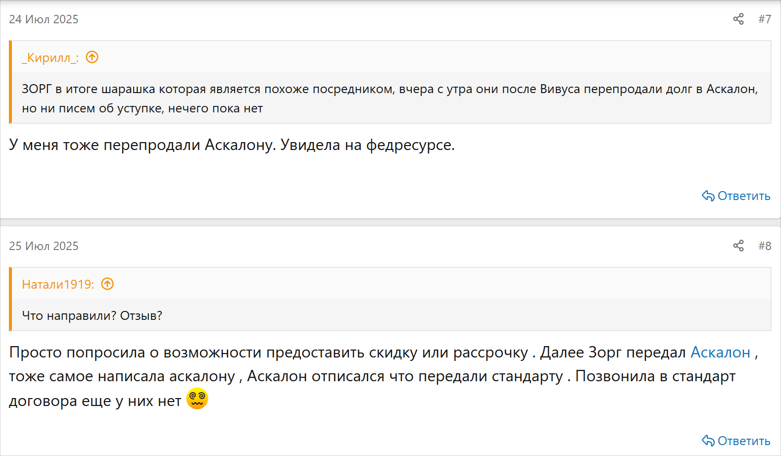 На форумах пишут, что ПКО «Зорг» часто выкупает просроченные долги у ООО МКК «СМСФИНАНС» (бренд «Вивус»). Спустя недолгое время, долг могут перепродать в другое коллекторское агентство. Среди перекупщиков, о которых пишут в отзывах: