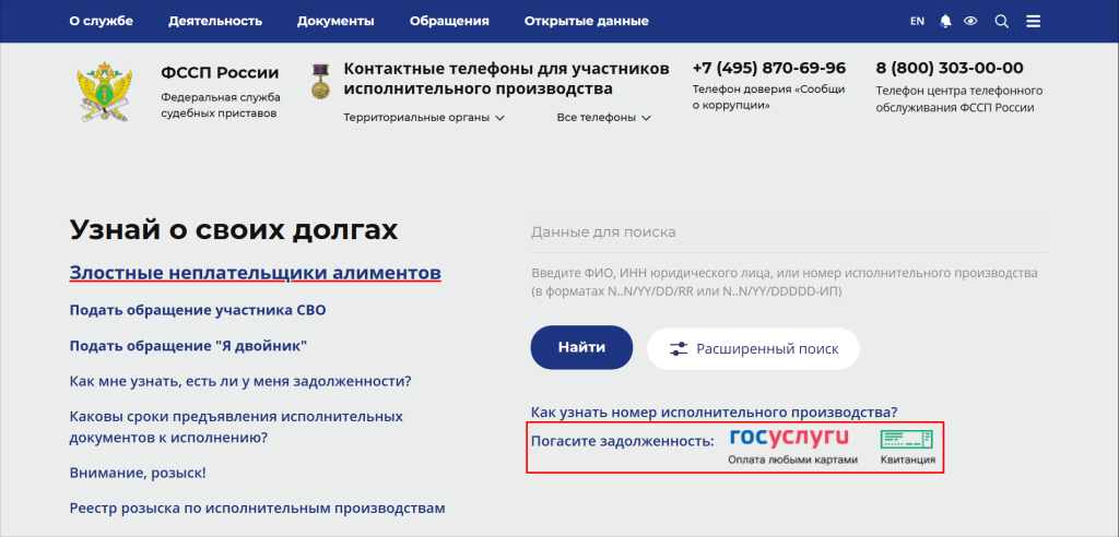 На сайте ФССП нет возможности выполнить платеж напрямую. Должник будет перенаправлен на Госуслуги.