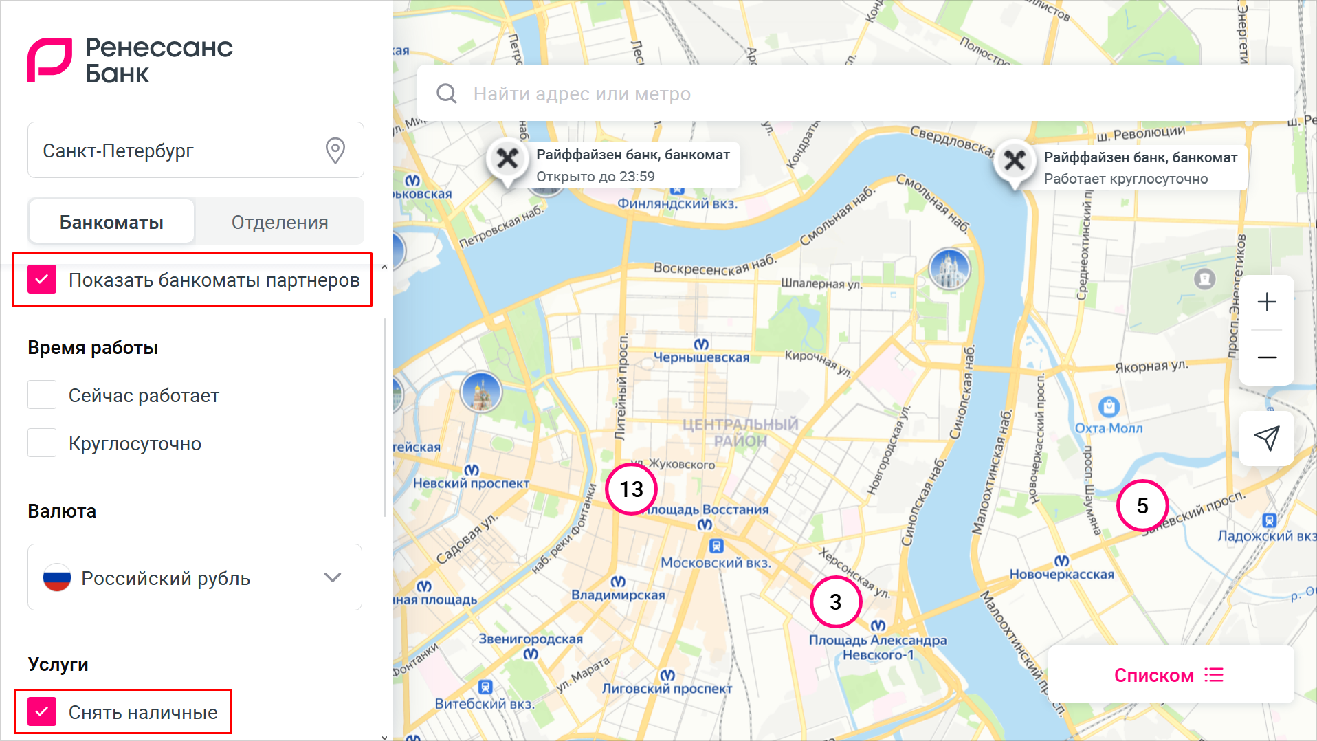 Найти банкомат РБ или банка-партнера можно в разделе «Отделения и банкоматы» на официальном сайте rencredit.ru. Для корректного поиска в меню слева укажите город, что ищете — отделение или банкомат — и цель визита. Отметьте галочкой «Показать банкоматы партнеров». Система выдаст ближайшие банкоматы или отделения по вашему запросу — на карте или списком.