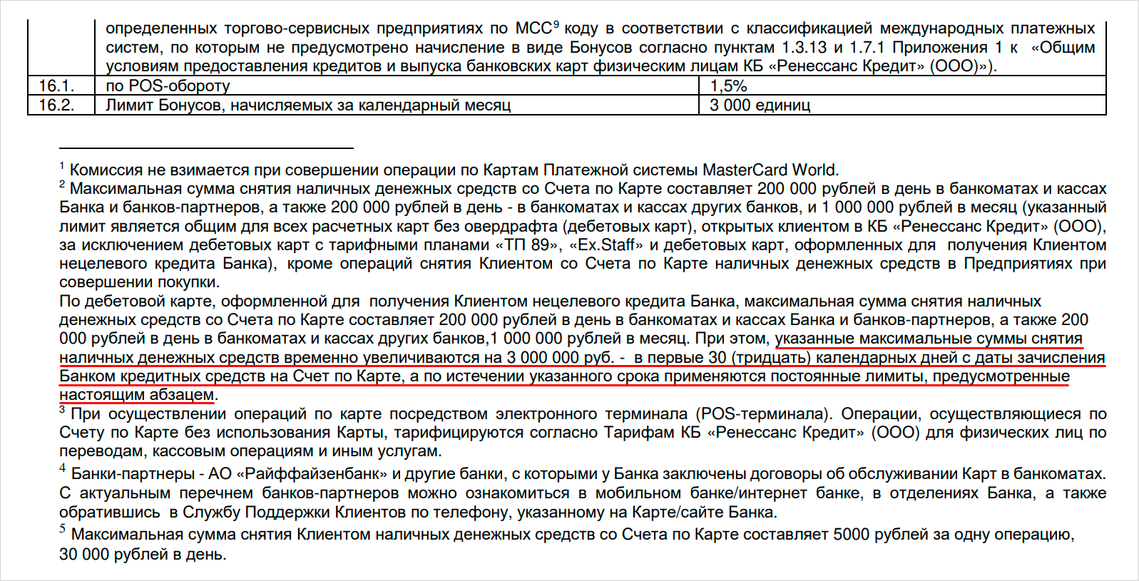 Если дебетовая карта оформлена в банке «Ренессанс Кредит» для получения нецелевого кредита, то лимит снятия наличных в первые 30 календарных дней с даты зачисления кредита увеличивается до 3 млн рублей.