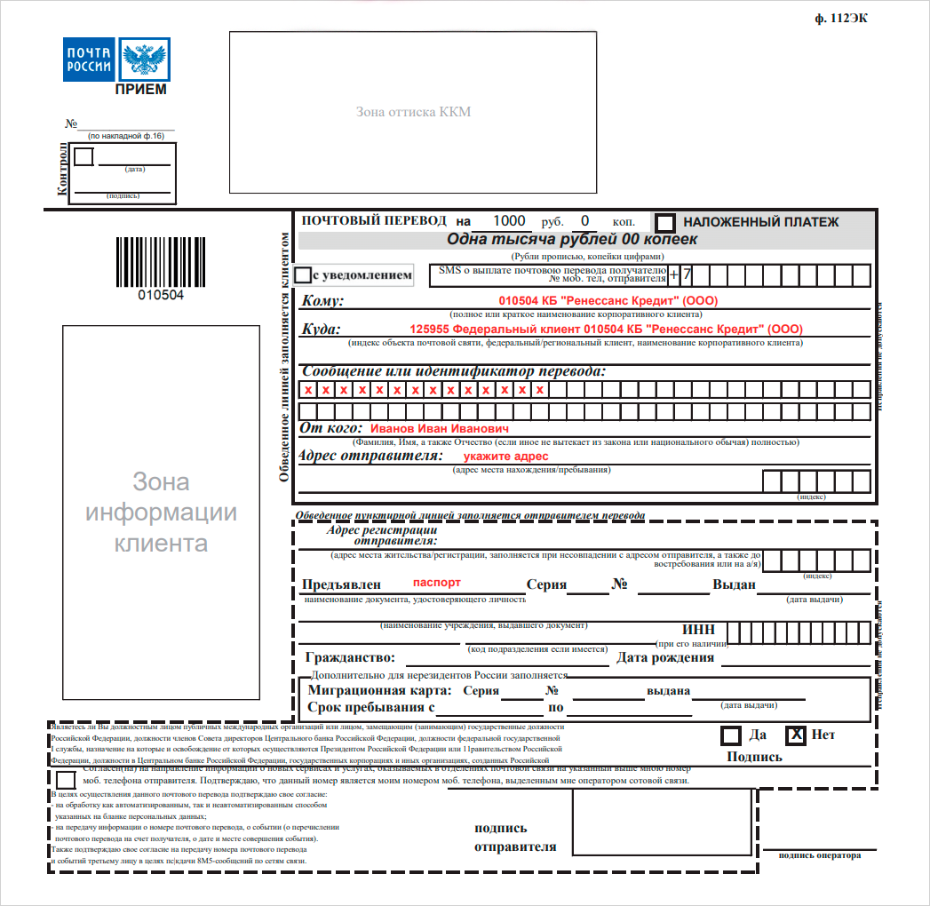 «Ренессанс Кредит» не устанавливает комиссию за пополнение карты через свой терминал или терминал партнера, но предупреждает клиентов, что ее может взимать банк-отправитель за перевод с карты.