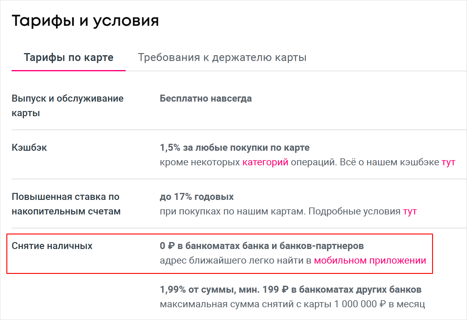 Чтобы снять наличные в банкомате или офисе чужого банка, придется заплатить комиссию. Она составляет 1,99% от запрашиваемой суммы, но минимум 199 рублей. Столько же спишут за выдачу наличных на кассе в магазине или в аптеке, если снимете деньги во время покупки с помощью опции «кэшаут». Получить наличными с карты в магазине или при оплате сервисов можно до 5 тысяч рублей за одну операцию и до 30 тысяч в сутки.