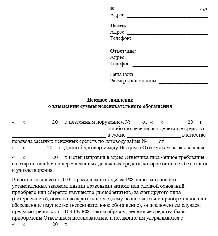 Исковое заявление о возврате неосновательного обогащения. Для его подачи возбуждение уголовного дела не является обязательным. Исковое заявление о неосновательном обогащении можно подать против владельца счета, на который были переведены ваши деньги, даже если вы не планируете обращаться в полицию.