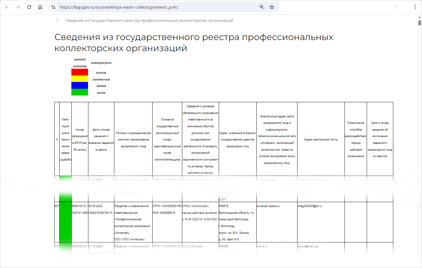 Каждое коллекторское агентство имеет цветовую маркировку. Зеленый означает, что компания действует по закону и не имеет жалоб от должников. Красный цвет указывает, что коллекторы погрязли в нарушениях. ООО ПКО «Интеграл» отмечен зеленым индикатором.