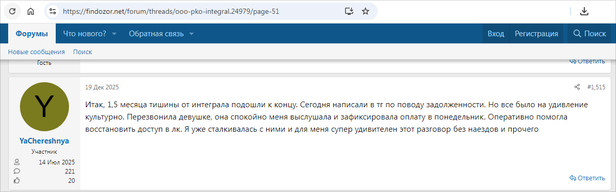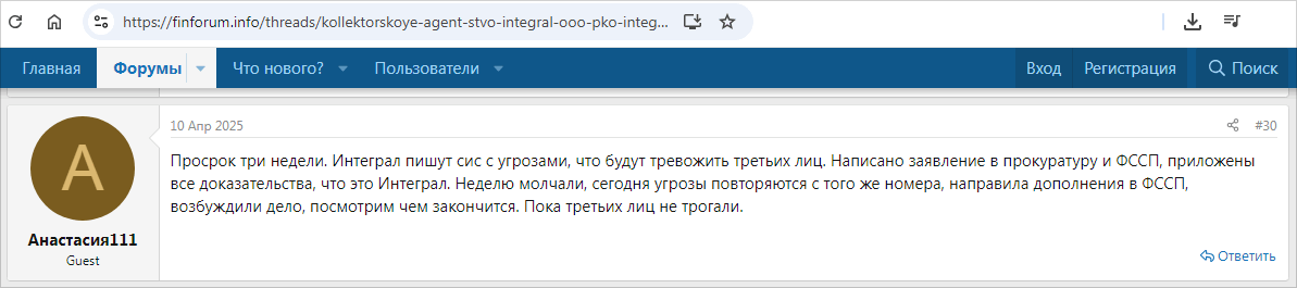 Впрочем, некоторые отмечают учтивость коллекторов «Интеграла» и даже готовность помочь. Вот сообщение с форума «Финдозор».