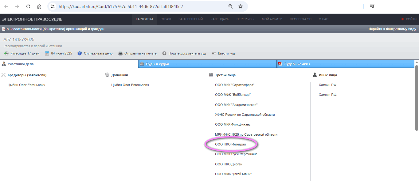 Зато в картотеке есть дело о банкротстве гражданина, где ООО ПКО «Интеграл» указан среди других кредиторов.