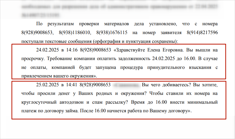 Суть нарушения: коллекторы использовали в переписке с должником угрозы, обещая позвонить родственникам и включить автоматический дозвон, что противоречит ст. 7 закона № 230-ФЗ.