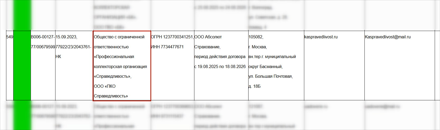 ООО ПКО «Справедливость» внесено в реестр ФССП под порядковым номером 549. Оно отмечено зеленым цветом — следовательно, за последний отчетный период на агентство не поступало подтвердившихся жалоб.