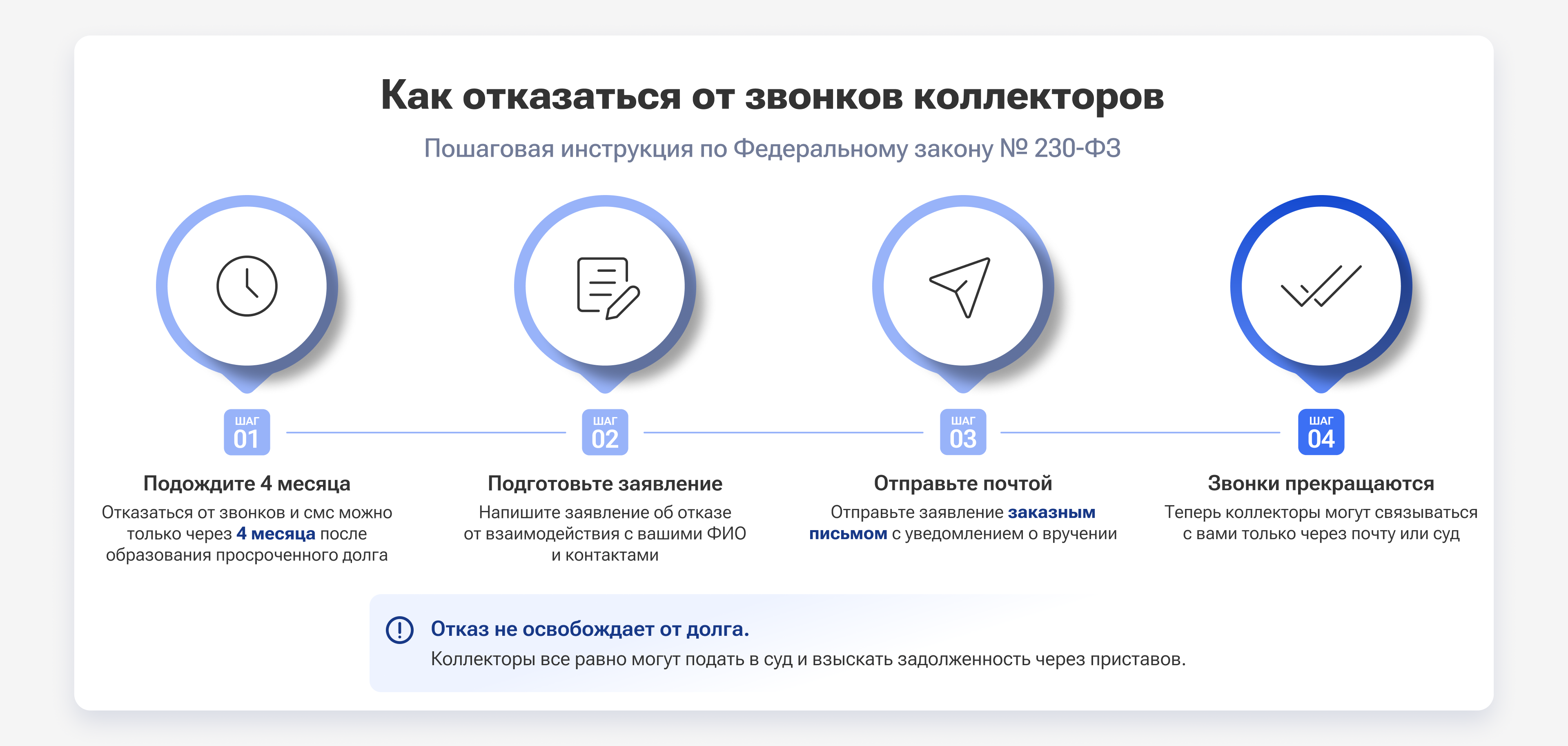 Но если вы не можете погасить долг, не готовы ничего предпринимать и просто хотите прекратить звонки коллекторов, направьте заявление об отказе от взаимодействия с ними. Такой отказ обязаны принять, если кредит или займ получил статус просроченного более 4 месяцев назад.