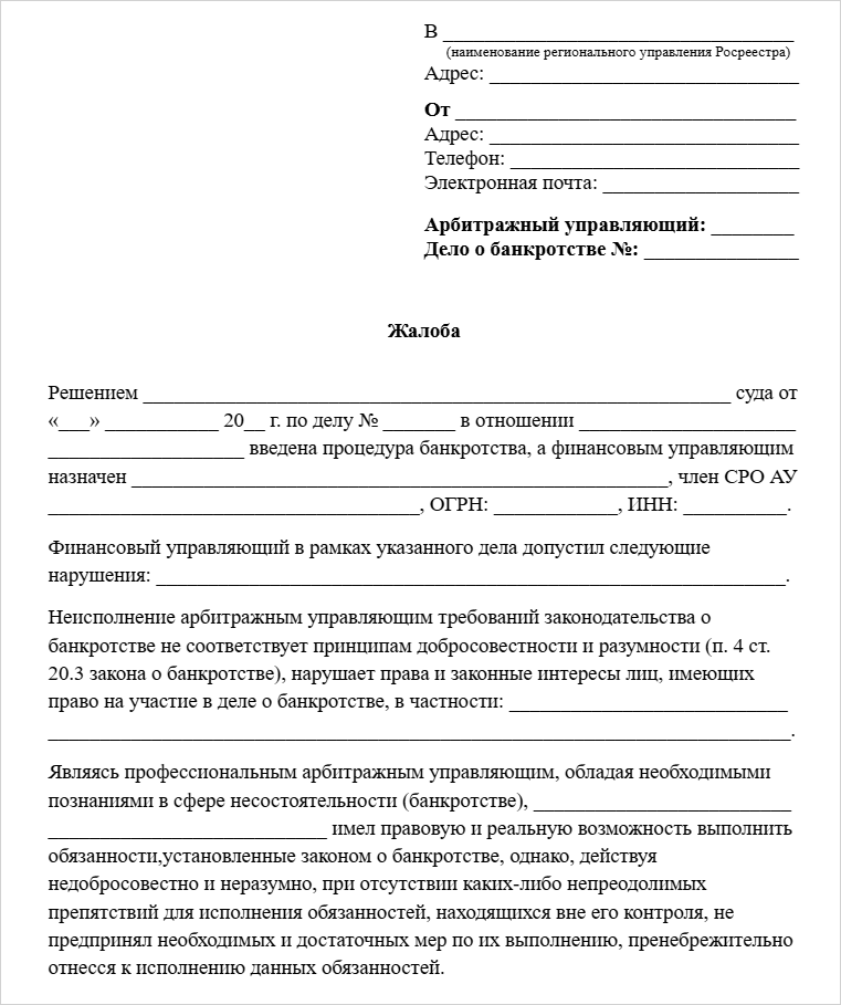 - Что управляющий действительно нарушил права должника и это нарушение привело к значительным убыткам. За формальные недочеты от процедуры не отстранят. Но это не значит, что должнику придется с ними мириться. На действия управляющего, которые идут вразрез с законом, можно подавать жалобы.