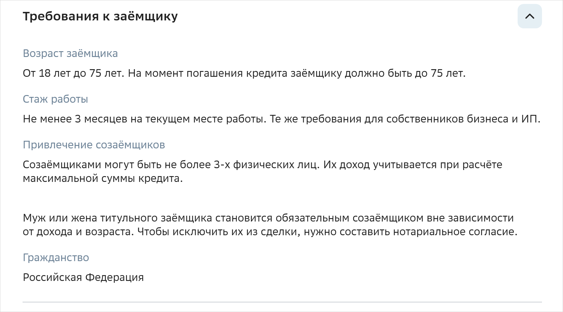К солидарным заемщикам банки предъявляют те же требования, что и к титульным. Обязательно наличие российского гражданства и постоянной регистрации в регионах присутствия банка. Верхний возрастной порог на момент окончания договора варьируется в зависимости от политики кредитной организации, но обычно не превышает 75 лет. Кандидат в созаемщики должен быть официально трудоустроен и иметь хотя бы несколько месяцев стажа.