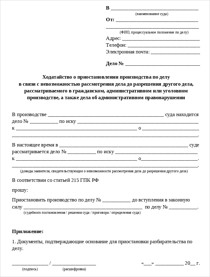 Название | Заголовок — «Ходатайство о приостановлении производства по делу». |