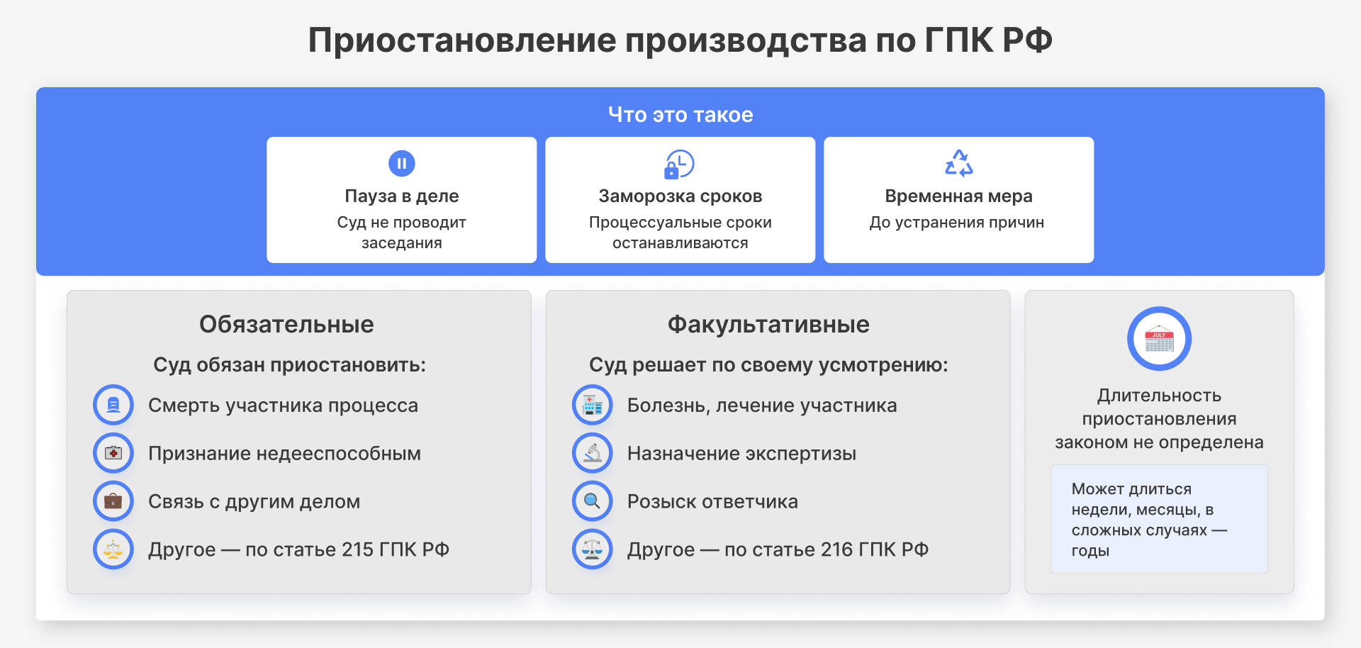 Какой закон регулирует. Приостановлению производства по гражданскому делу посвящена глава 17 Гражданского процессуального кодекса (ГПК РФ). Например, в статье 215 ГПК РФ перечислены основания, по которым суд обязан приостановить рассмотрение. А в статье 216 — когда не обязан это делать, но может приостановить по своему усмотрению.