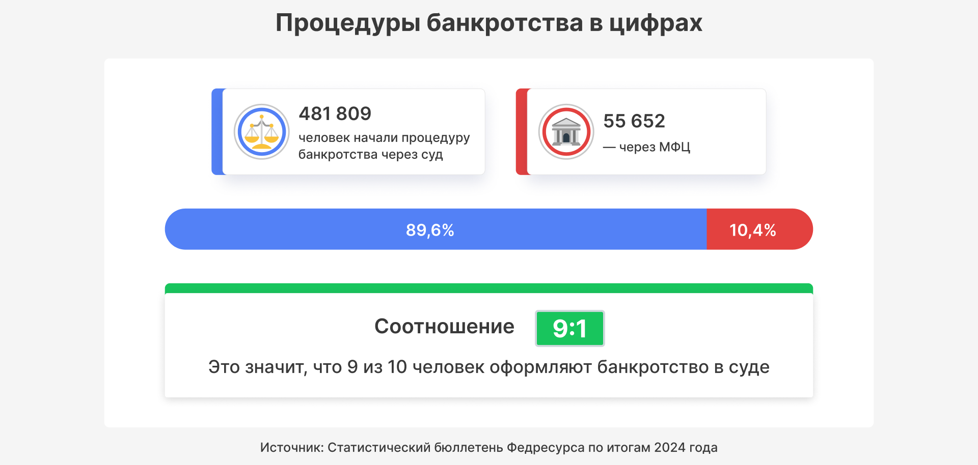 На первый взгляд банкротство через МФЦ кажется проще. Но есть подвох: оно подходит только единицам. Большинство заявителей отсеивают еще на старте — об этом говорит статистика.