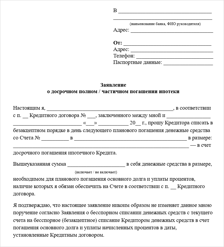 - Направить в банк заявление о досрочном погашении. В договоре обычно указывают, за сколько дней до внесения денег нужно уведомить банк. По закону это 30 дней.