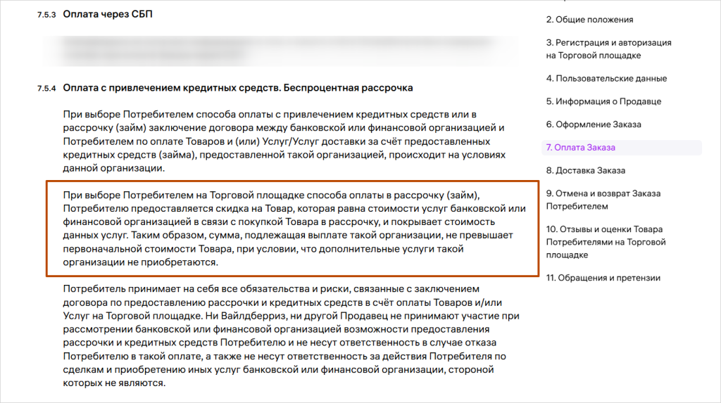 Что интересно: в Договоре комплексного банковского обслуживания физических лиц в ООО «Вайлдберриз Банк», оплата в рассрочку и частями описаны в одном пункте без разделения. Причем способ «в рассрочку» указан в кавычках. Возможно, кавычки показывают, что термин используется маркетплейсом и банком условно — для удобства покупателей.