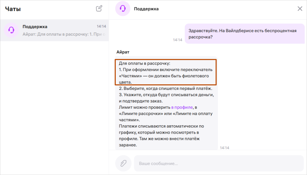 Если задать вопрос в чате поддержки ВБ об условиях беспроцентной рассрочки, бот предложит рассмотреть вариант оплаты частями.