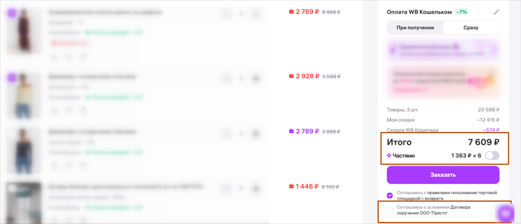 - Поставьте галочки рядом с условиями предоставления рассрочки и с договором «Престо». Обратите внимание: такой галочкой вы соглашаетесь на автоматические списания денег с вашей карты и WB Кошелька.