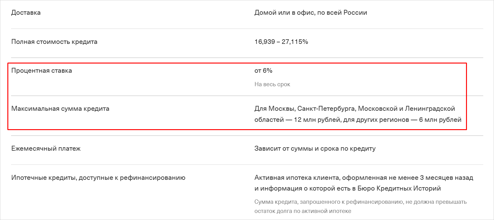 - Льготную семейную ипотеку с государственной поддержкой для заемщиков с детьми. Здесь ставка — от 6% годовых, а сумма — до 12 млн для Москвы и области, Санкт-Петербурга и Ленинградской области. Для остальных регионов — сумма кредита составляет максимум 6 млн рублей.