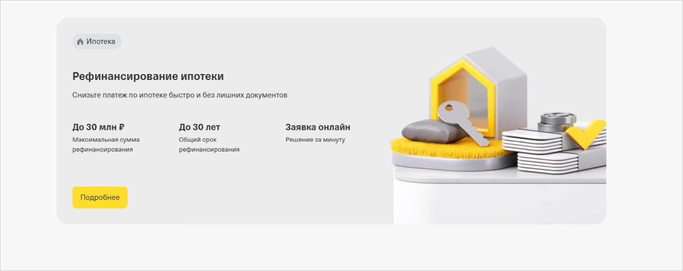 - Выберите «Рефинансирование». Далее — «Ипотека» и «Подробнее».