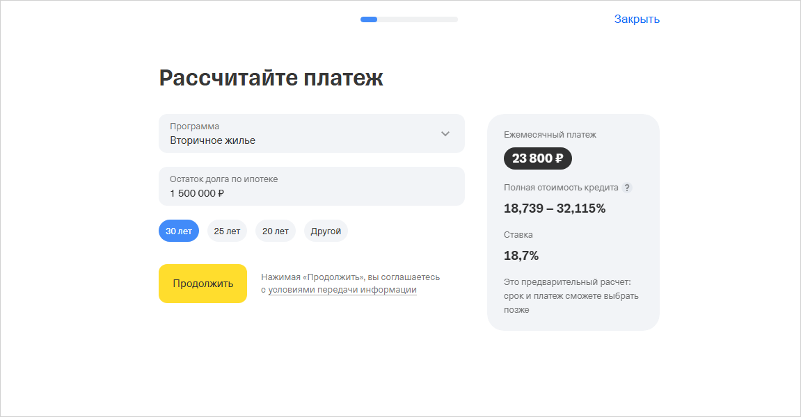 - Укажите «Программу» ипотечного кредитования, остаток долга, выберите срок. Когда введете данные, система покажет предварительный расчет. Если условия устраивают, выберите «Продолжить».