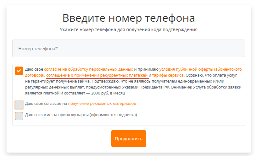 Например, при оформлении заявки на платформе Primezaim, сервис предупреждает о подключении рекуррентной подписки.