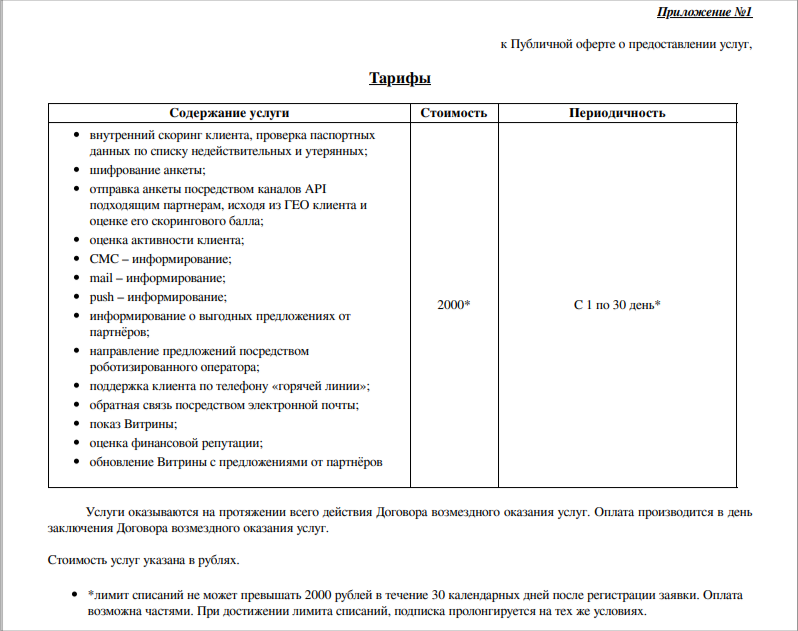 Такие организации могут взимать ежемесячную плату за доступ к витрине микрозаймов: то есть предложениям от разных МФО в одном месте. А еще за рассылку рекламных предложений и кредитный скоринг. Суммы обычно небольшие — от 200 до 2000 рублей, списывать могут с разной периодичностью: от одного дня до месяца.