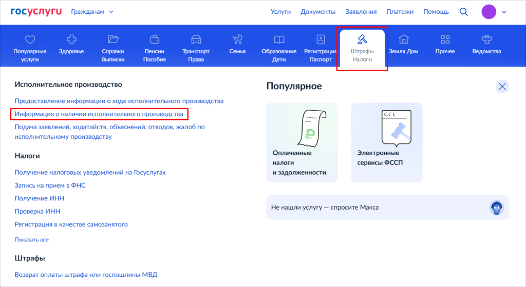- На главной странице сайта откройте вкладку «Штрафы и налоги».