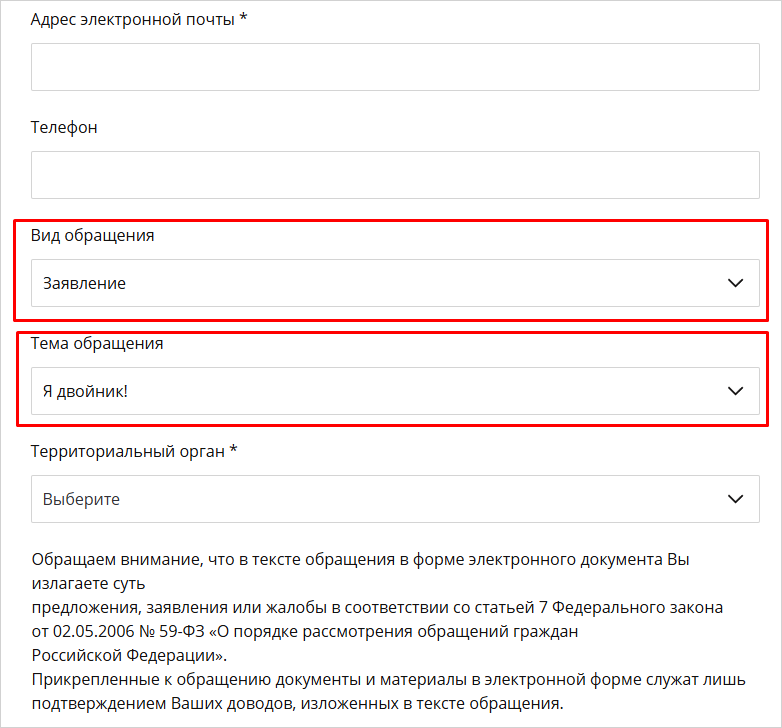 Само собой, оплачивать долги другого человека не нужно. О проблеме необходимо сообщить приставам: на личном приеме, по телефону или через интернет-приемную на сайте. В поле «Вид обращения» выберите «Заявление», а темой обращения — «Я двойник!».