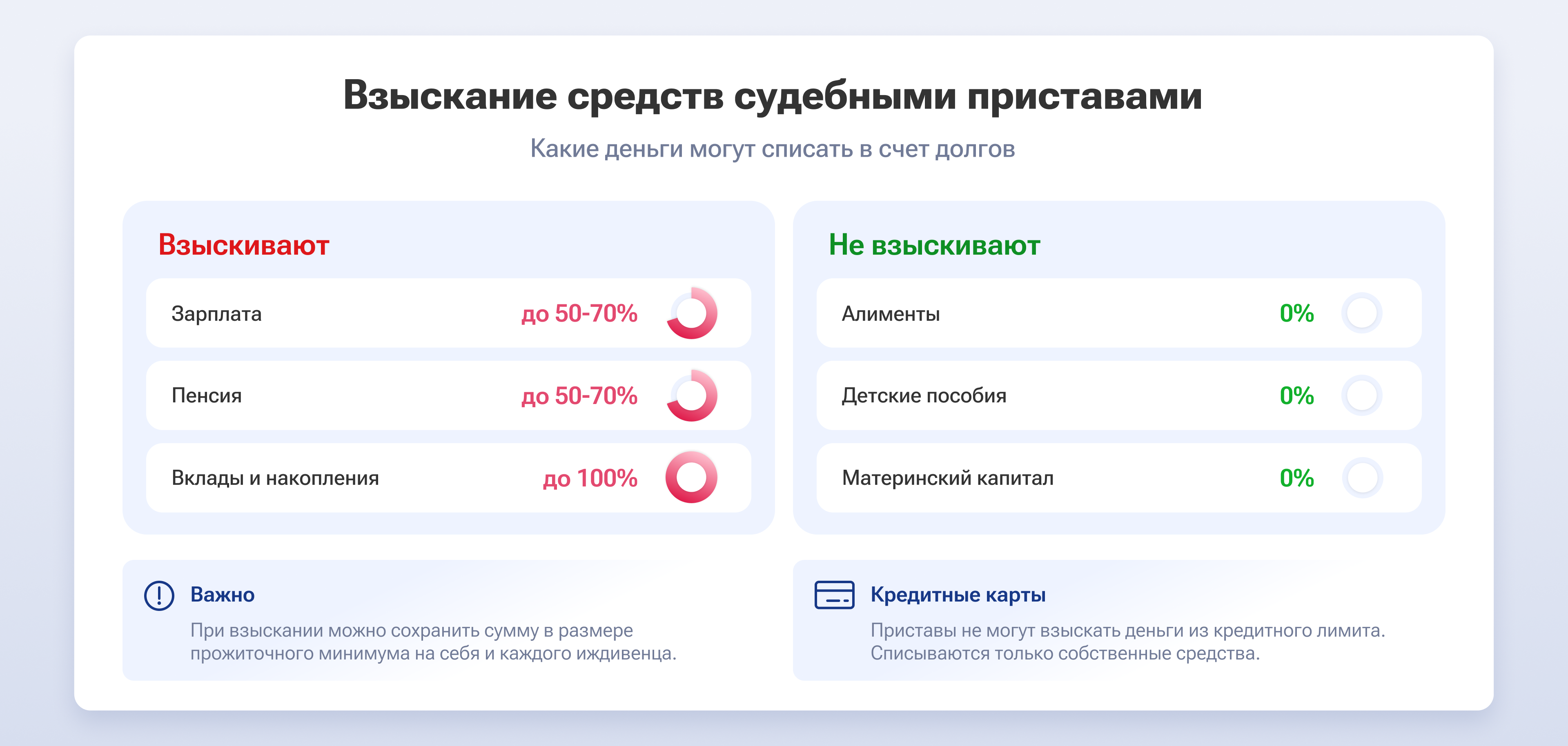 Приставы могут взыскивать любые доступные средства, но есть ряд ограничений: