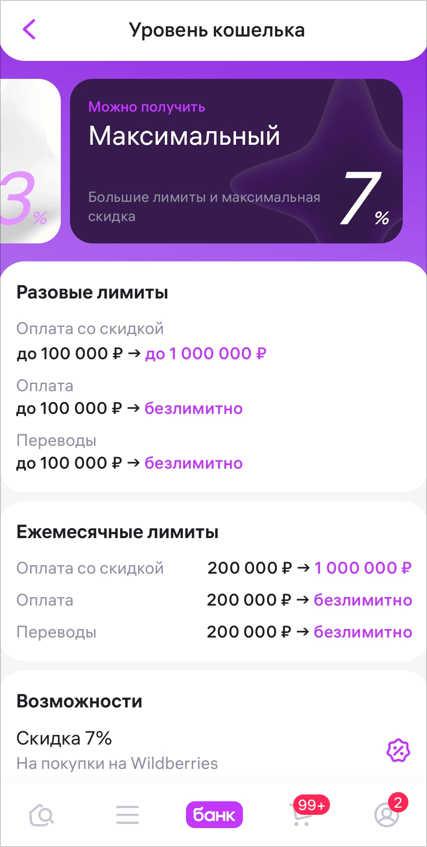 Что делать: посмотрите, какой у вас уровень кошелька. Для этого откройте приложение WB, выберите «Банк» и найдите раздел с информацией о кошельке. Если хотите снять ограничения, повысьте уровень до максимального, следуя инструкциям в приложении.