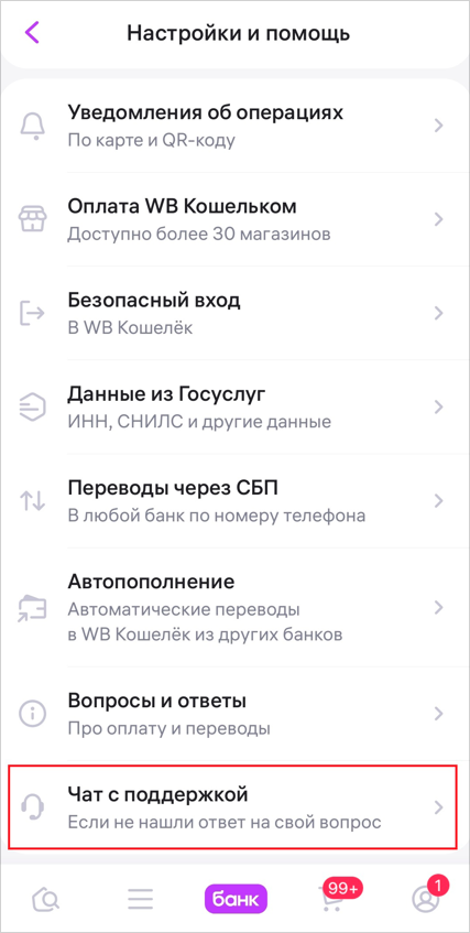Если по-прежнему не получается сделать перевод, напишите в техподдержку с указанием точного времени ошибки. Чат с поддержкой можно найти в разделе «Настройки и помощь» ВБ Банка (три горизонтальные точки в правом верхнем углу экрана).
