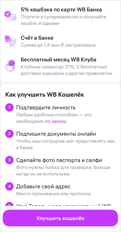 Шаг 2: посмотрите статус профиля. Если ваш кошелек не идентифицирован, часть функций недоступна. Чтобы повысить уровень до максимального, войдите в настройки профиля в приложении ВБ Банка и выберите «Улучшить кошелек».