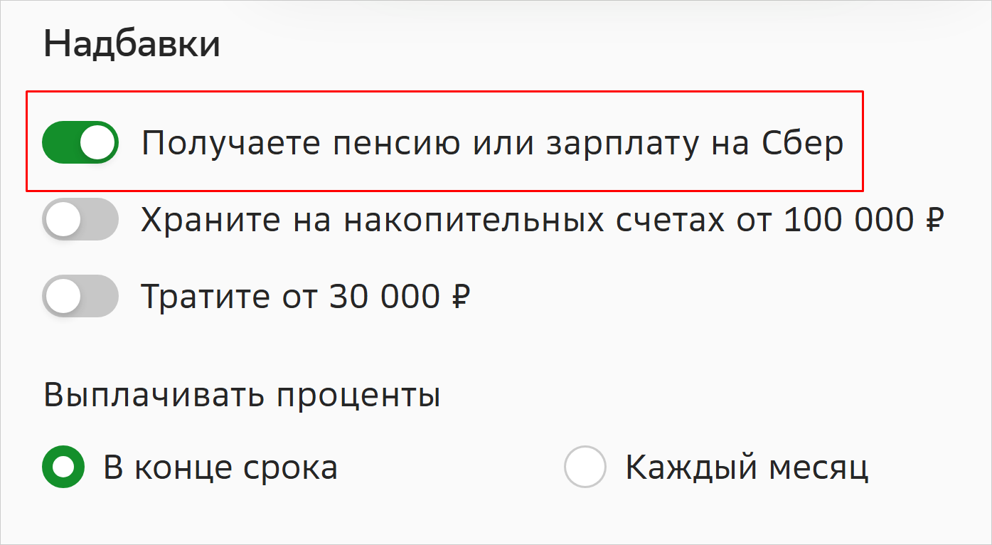 Получать зарплату, пенсию на карту Сбербанка или тратить от 30 000 рублей в месяц (еще +0,5% к ставке).