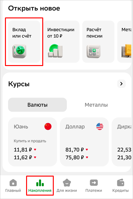 - Открытие счета — онлайн или в офисе. В первом случае проценты больше. Открыть вклад можно в приложении Сбербанка или на сайте.