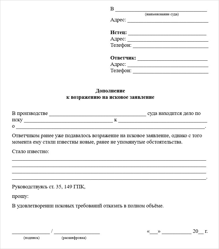Как написать дополнение к возражению