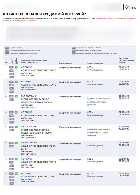 Кредитная история выглядит как отчет на нескольких страницах. В начале: ваши паспортные данные, ИНН и СНИЛС. Дальше — список всех задолженностей с суммами, сроками и отметками о платежах. Еще есть информация о кредитном рейтинге и компаниях, которые запрашивали доступ к истории.