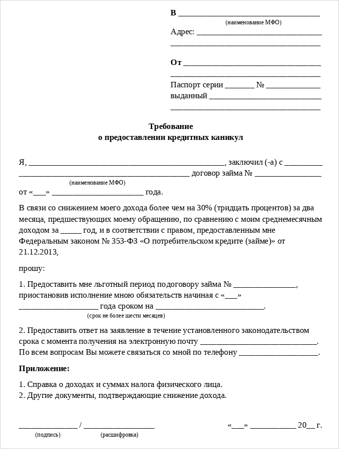 Возьмите кредитные каникулы. В некоторых ситуациях, например, если доходы резко упали на 30% и больше, вы можете требовать (именно требовать, а не просить) кредитные каникулы. Так гласит статья 6.1-2 Федерального закона № 353-ФЗ. Вы получите отсрочку максимум на 6 месяцев.