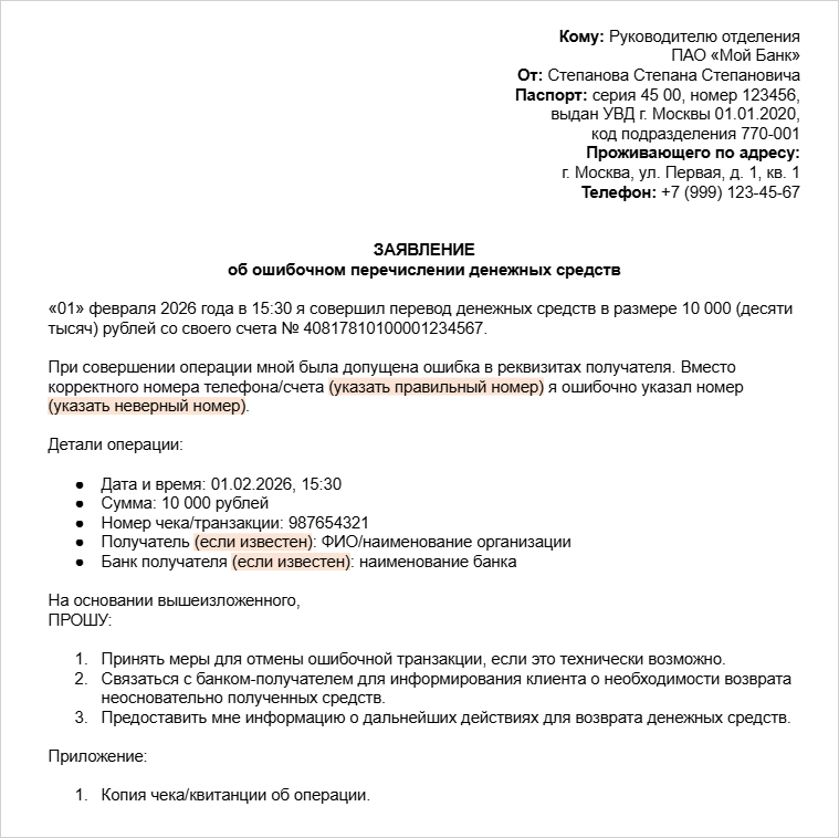 - Немедленно обратитесь в свой банк. Напишите заявление об ошибочном переводе. Чем быстрее это сделаете, тем выше шанс, что платеж еще не отправили и его можно остановить.