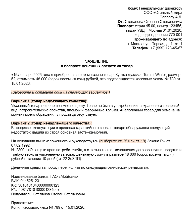 Если возвращаете бракованный товар, приложите гарантийный талон. Либо акт из авторизованного сервисного центра — статья 18 ЗоЗПП позволяет обращаться туда напрямую, минуя продавца.
